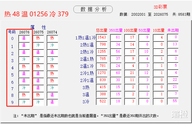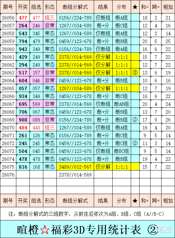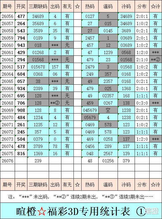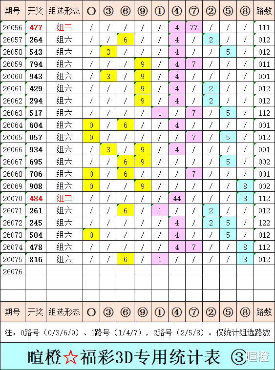 26076期:暄橙福彩3D综合条件(本期将在3月27日21:15开)一、上期回顾 ☆1、上期开奖号:8 1 6。2、和值= 15,跨度= 7。3、常态组六,012路组合。4、热度分布(热:温:冷)1:1:1。二、本期条件 ☆1、三期缺码:239。2、热:48,温:01256,冷:379。3、断组分解式:2378//014-569。4、四胆:1237;三胆:127。三、术语解释 ☆1、三期缺码:0至9这十个自然数当中,未在近三期开奖号出现的数字。2、热度(热温冷):自然数0至9,在近七期开奖号中,出现3次及3次以上的数字,称为热码;出现2次的数字,称为温码;出现1次和未出现的数字,称为冷码。某个数字在开奖号中出现几个,就按几次计算。3、断组分解式:将0至9这十个自然数,分成三组数字,从前往后依次为A组(4码)、B组(3码)、C组(3码),一般情况下,有一组数字不出码,偶尔会有两组数字不出码。A组不出码的情况相对较少。断组为主,分解为辅。4、常态组六号码:同时包含大数、小数、奇数、偶数、质数、合数的组六号码,共有72注。统计表中,简称“常态”。5、非常态组六号码:全大数、全小数、全奇数、全偶数、全质数、全合数等六种形态的组六号码,共有48注。统计表中,简称“非常”。★提醒:彩市有风险,参与须谨慎!水平有限,仅供参考!