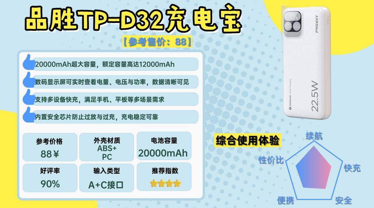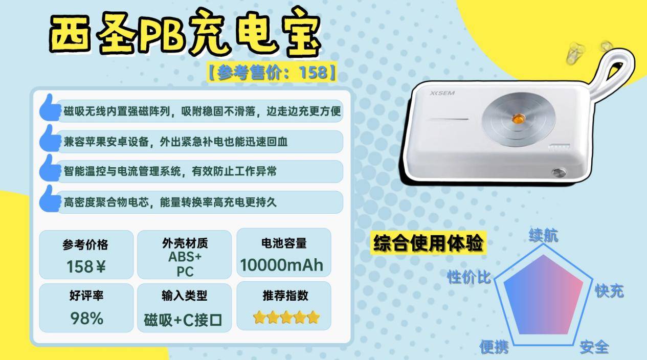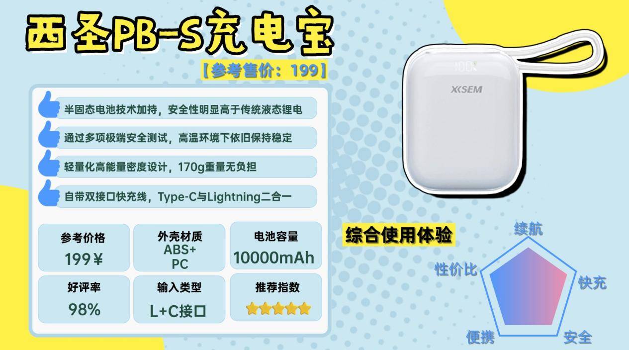 如果要选一款极致性价比的充电宝,西圣 PB-S 无疑是当前百元档中最具代表性的选择之一。它在安全性与快充性能上的综合表现,比同类产品领先一代,核心性能上,PB-S 的快充输出稳定性提升 116%,充电速度提升 44%,同时在高频使用下实现 电池循环寿命提升 51%,并将对充电设备的潜在损害率降低 96%。这种表现,上市初期收到数码行业热捧,被不少媒体评价为超越同价位、接近高端产品水准,称其为2026年度“安全快充”性能之王。