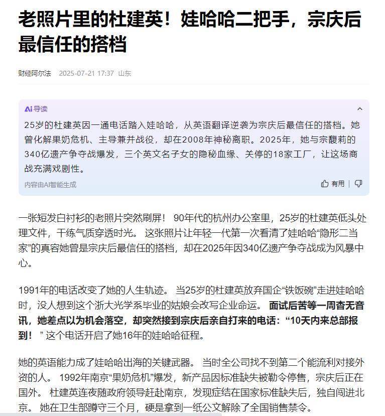 宗庆后的手写信托指示,不仅是一份法律文件,更是一份信任的见证。它告诉我们,杜建英并非外界所误解的那样,而是一位值得宗庆后托付家族未来的女性。她的合法身份、在娃哈哈的重要地位、以及在这场纠纷中展现出的理性和坚定,都证明了这一点。或许,在这场风波过后,人们会重新认识杜建英,理解宗庆后为何会对她如此信任。毕竟,能被宗庆后这样的商业巨擘选中托付身后事的人,绝非等闲之辈。