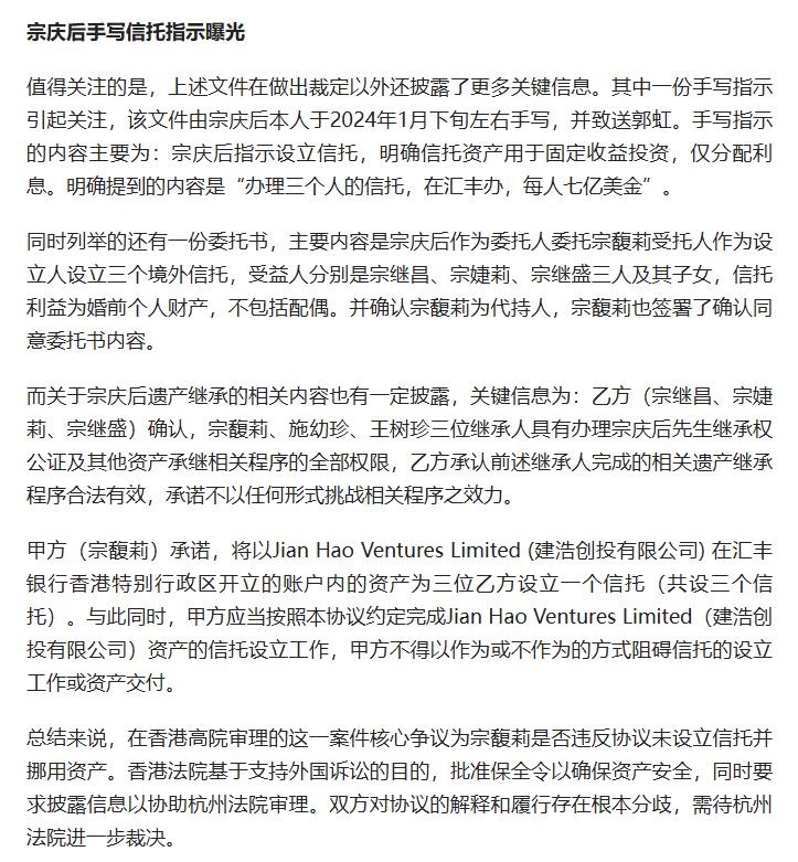 2025 年 8 月 1 日,香港高等法院的一纸裁定,将娃哈哈创始人宗庆后身后的家族纷争推向了新的高潮。法院批准了宗继昌、宗婕莉、宗继盛三名原告的资产保全申请,冻结了宗馥莉掌控的 Jian Hao Ventures Limited 在香港汇丰银行账户中的 17.99 亿美元资产。这一裁定的背后,是宗庆后生前手写的信托指示曝光,不仅揭开了家族信托的神秘面纱,更印证了杜建英 —— 这位曾被外界误解的女性,实为宗庆后生前可以托付之人。