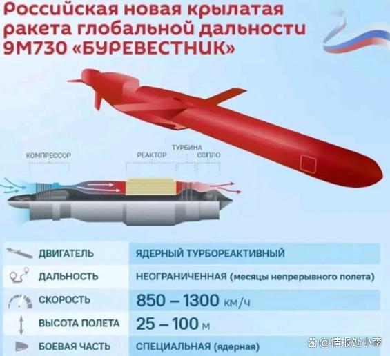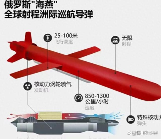 “海燕”核动力巡航导弹采用小型核反应堆推进,理论射程近乎无限,可在50-100米超低空持续飞行数十天。2025年10月21日的试验中,其飞行1.4万公里(持续15小时)并成功展示规避反导系统的能力。普京特别强调,该导弹“全球尚无同类产品”,其核反应堆启动速度达到“分秒级”,远超传统核动力装置数天的启动时间。