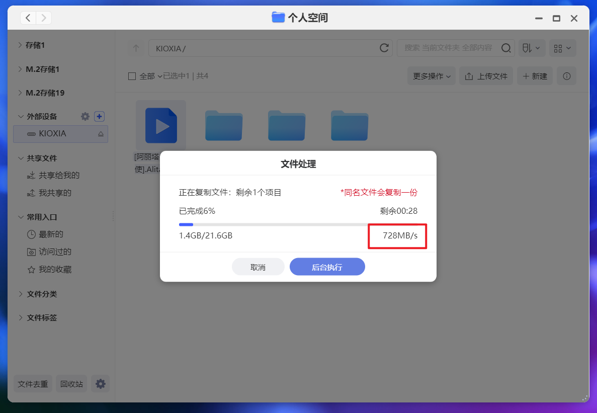 🔺在极空间内的数据传输速度也能达到700+MB/s,传输性能还是不错的。