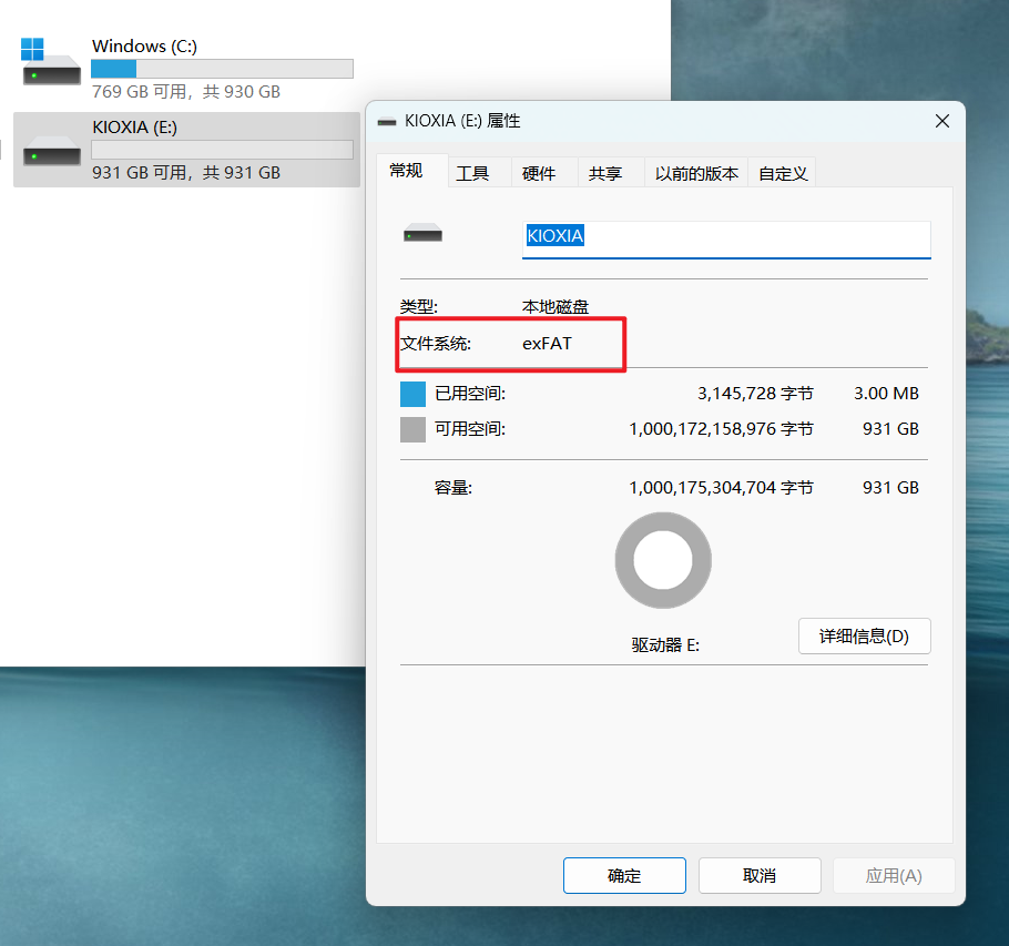 🔺在硬盘“属性”里面我们可以看到更详细的信息。划重点!可以看到它的文件系统格式为“exFAT”,所以这也是它广泛兼容的奥秘所在。同时容量中也显示了我上边所说的两种不同计量方式。