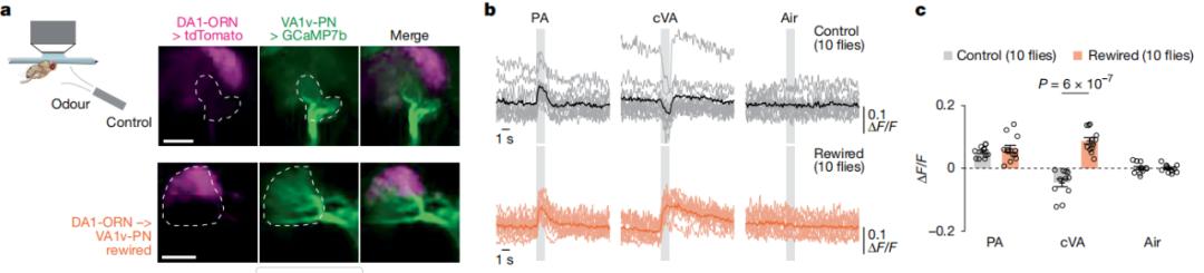 结果发现在正常的果蝇大脑中,VA1v 中转站只对促进求爱的 PA 气味有反应,对于禁止求爱的 cVA 气味则产生了抑制。而在更换线路之后的果蝇大脑里,VA1v 中转站同时对 PA 和 cVA 都产生了兴奋反应。