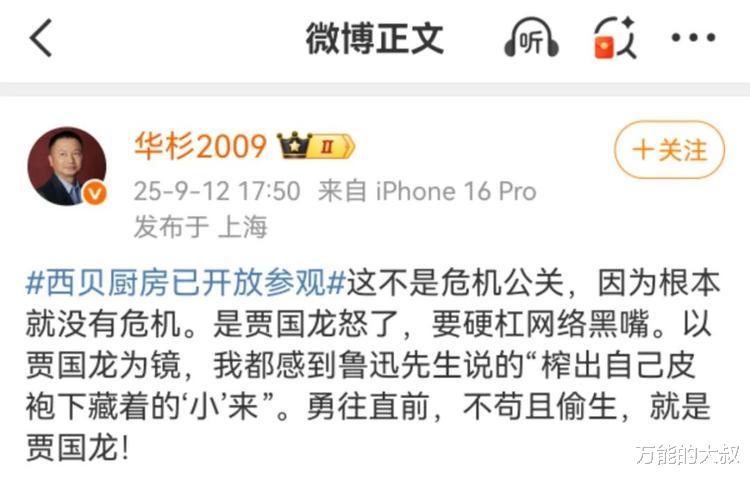 9月12日,华杉第三条微博,提到:“西贝根本就没有危机,是贾国龙怒了,要硬杠网络黑嘴。”第一次明确贴标签!