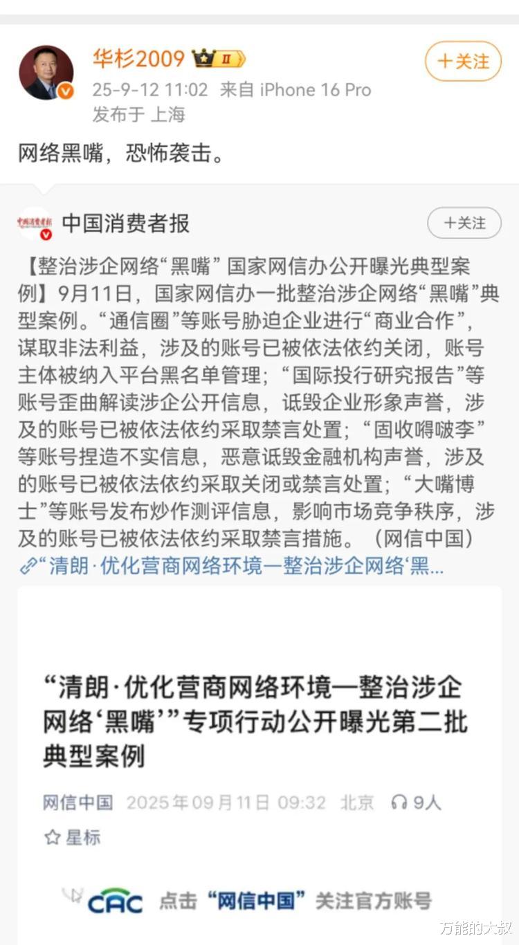 9月12日,华杉第二条微博,就转发了一条《整治涉企网络“黑嘴”国家网信办公开曝光典型案例》的报道,并转发:“网络黑嘴,恐怖袭击。”