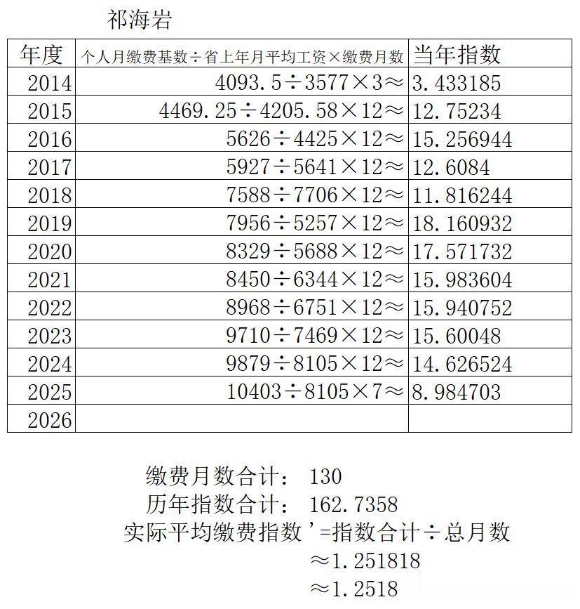 前几天,我给一位朋友祁海岩祁先生估算了他的视同缴费指数、实际缴费指数和全程平均缴费指数。