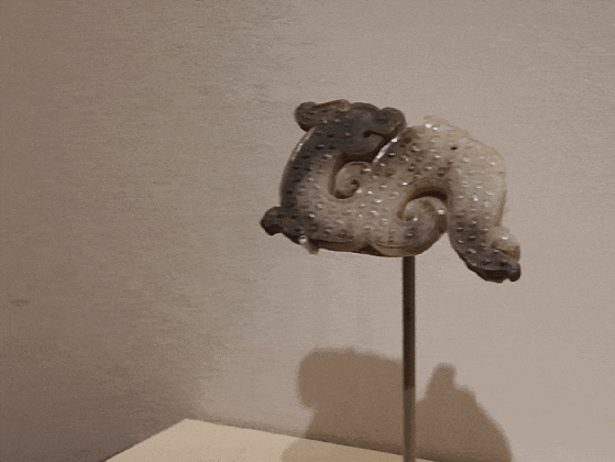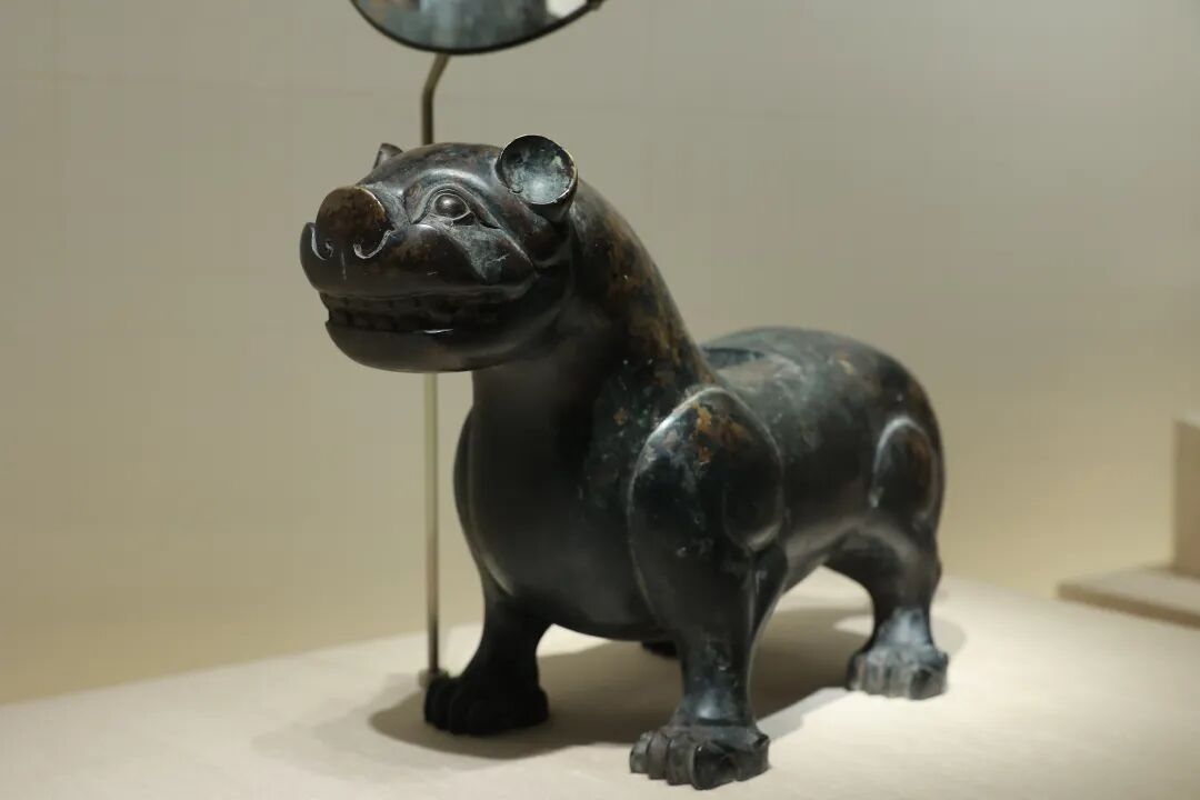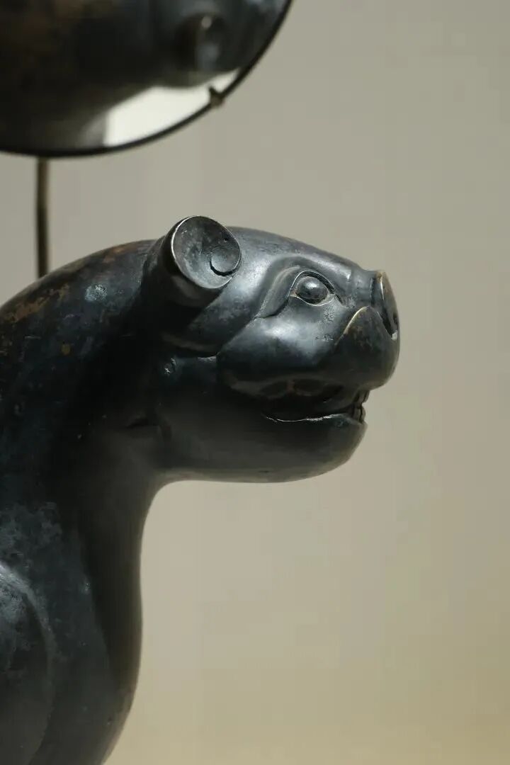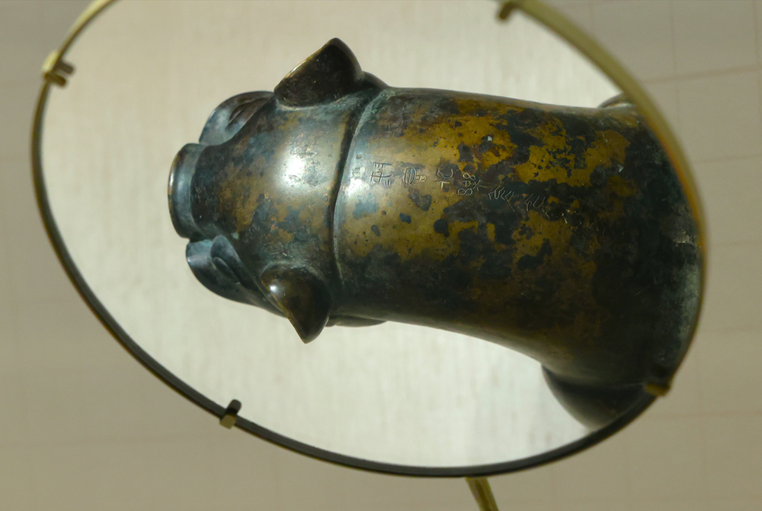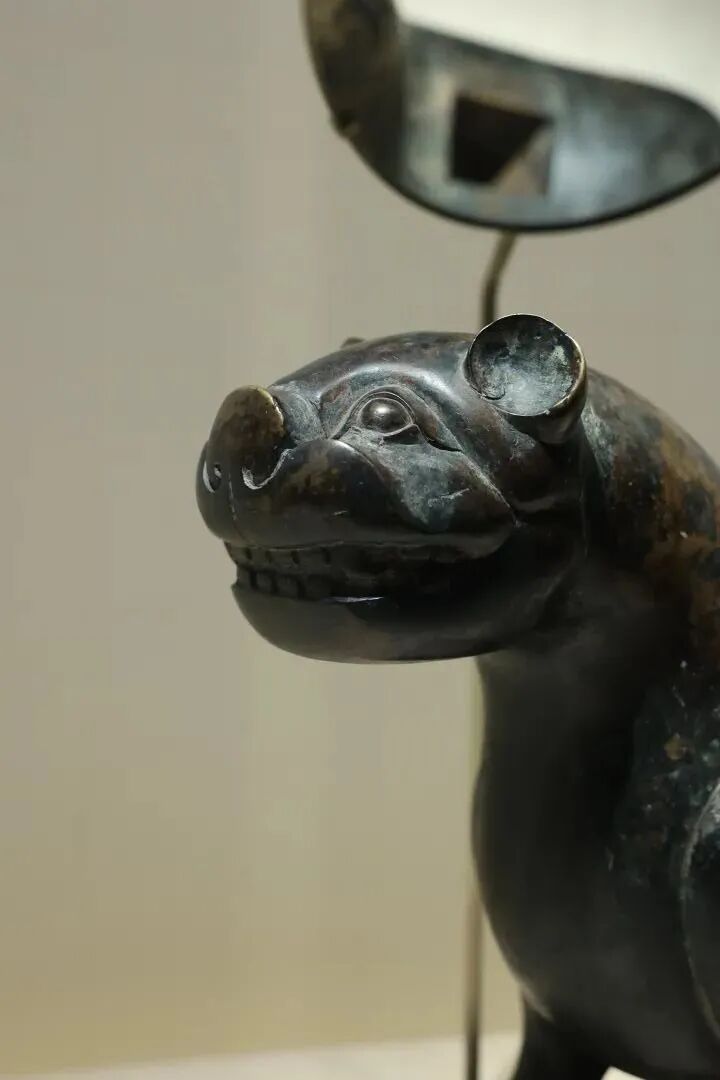 这是一套底座,共两件,虎形,功能为承载编钟架子两侧起支撑用的柱子。虎背上有长方形卯孔,颈脖处有铭文,展览现场放大展示,铭文能看得清清楚楚。