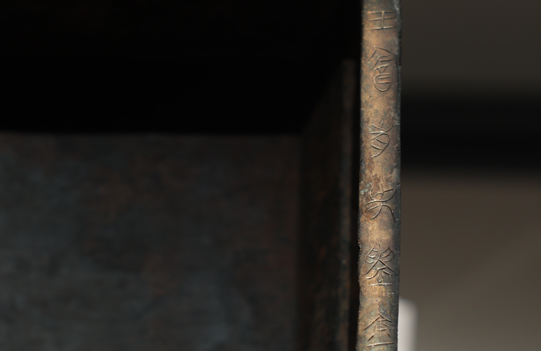 武王墩一号墓东室内出土了三件有楚王作器类刻铭的青铜器,其中一件青铜篮,器身带有12字铭文"楚王舍前作铸金簠以供岁尝"。