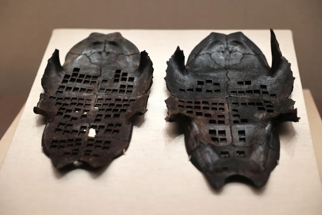 为了消解疑难,决策前途,楚人经常使用龟甲行卜。同时也是楚人重卜轻筮的实证。相比于春秋早、中期,武王墩一号墓所见卜甲变化较大,方形钻取代了双联钻。卜甲均保留甲桥,大部分腹甲反面均有钻凿痕迹,正面有兆纹,钻均为方形,边缘规整,多数钻内中部凿一道竖槽,个别写有墨书文字,为了解楚国占卜技术的发展演变提供了实物资料。