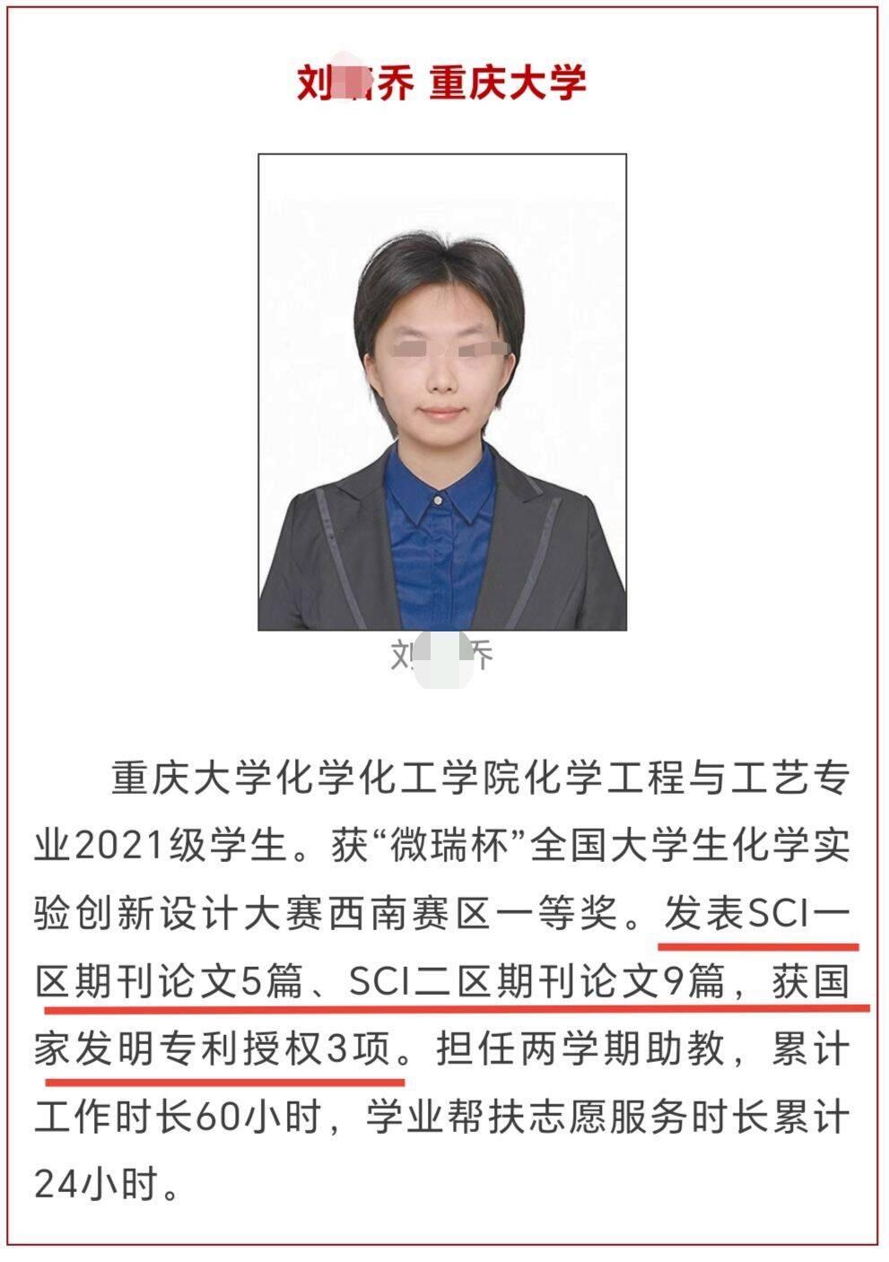 根据推文中的介绍,刘同学是重庆大学化学化工学院化学工程与工艺专业2021级学生,获“微瑞杯”全国大学生化学实验创新设计大赛西南赛区一等奖,发表SCI一区期刊论文5篇、SCI二区期刊论文9篇,获国家发明专利授权3项。