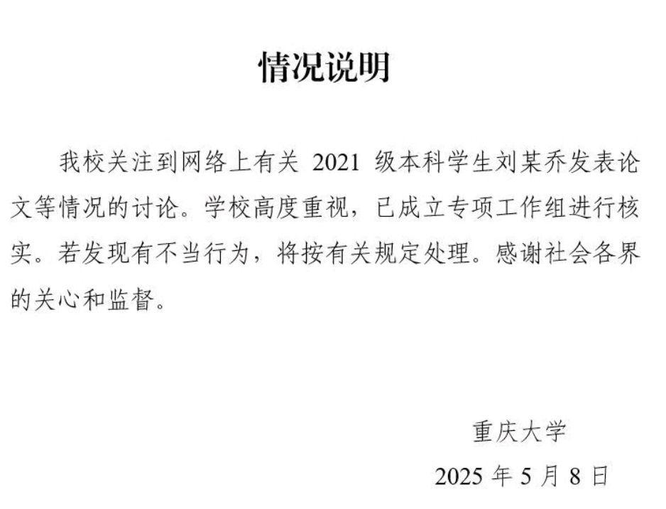 事情闹大之后,重庆大学终于顶不住压力,发布了一则声明,表示学校高度重视网络上反映的关于刘某乔的情况,已成立专项工作组进行核实,若发现有不当行为,将按有关规定处理。