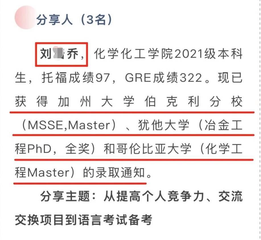 另外,在两个月前重庆大学留学经验分享会上,刘某乔还被邀请作为分享人上台跟学弟学妹们分享经验。根据公众号内容,刘某乔托福成绩为97,GRE(美国研究生入学考试)成绩为322,分数并不是很高,但也绝不是泛泛之辈。