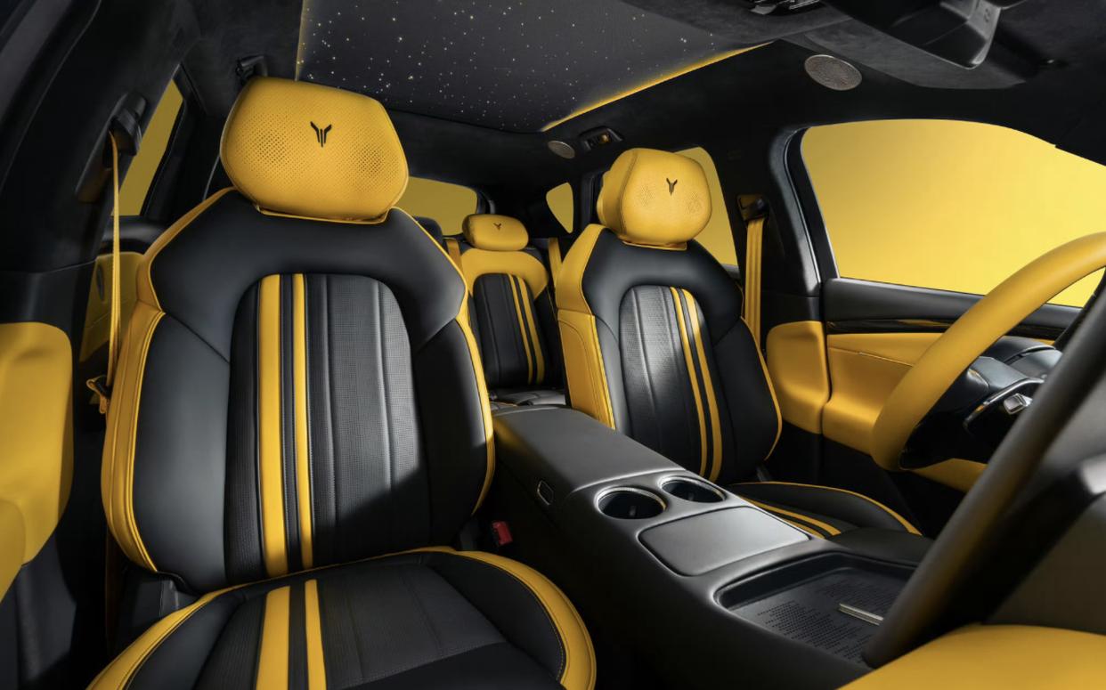 进入车内,岚图FREE+运动定制版采用玄金双拼撞色设计,并加入暗影哑光碳纤维组件进行点缀,还提供了智慧星空顶,用户通过语音指令即可唤出私享智慧星河,具有十二大定制模式、十四种可分区的星空色彩。环抱式中控台配备了黑黄双色多功能方向盘,搭配碳纤维组件和仿麂皮材质,增强运动氛围。科技感方面,新车搭载鸿蒙座舱HarmonySpace 5,集成15.6英寸中控大屏、10.25英寸液晶仪表和AR-HUD抬头显示,支持三屏联动操作。华为鸿蒙系统的加入实现了手机与车机无缝互联,支持应用流转、语音互联等功能。其它配置还包括女王副驾、7L车载冷暖箱和四门电吸门。