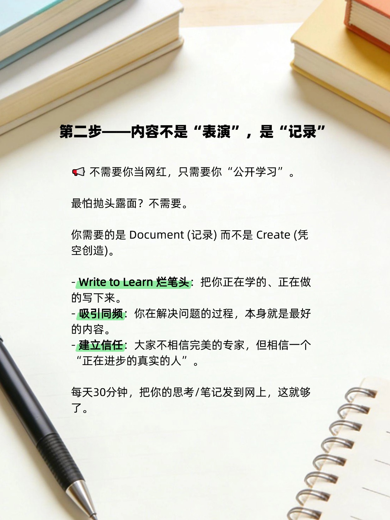 3️⃣ 内容即杠杆:不要为了流量做内容,要为了“连接”做内容。写给那些和你一样的人看。