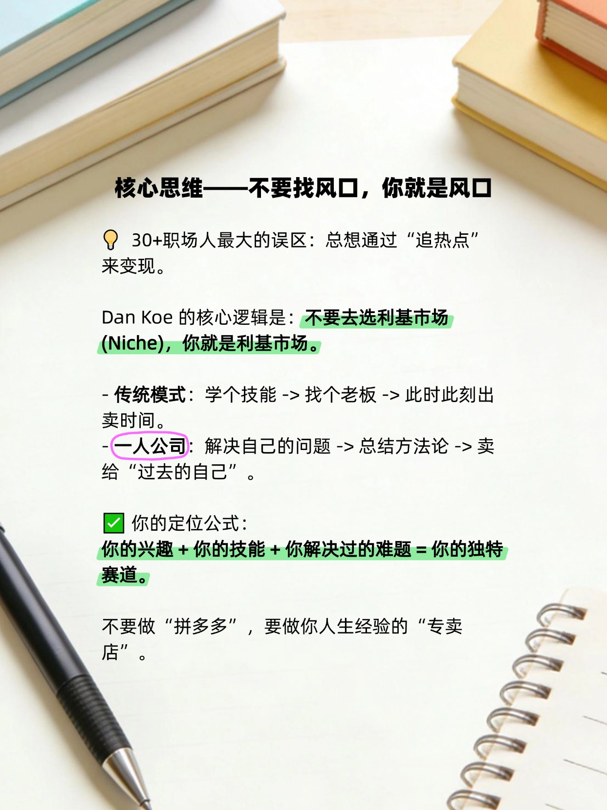 1️⃣ 你是谁,就卖什么:别去卷你不懂的赛道。你的性格、经验、甚至你踩过的坑,组合起来就是独一无二的护城河。