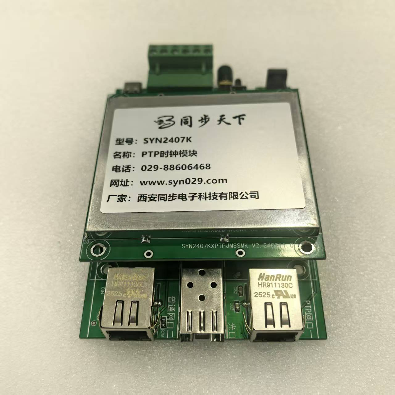 除核心同步能力外,SYN2407K模块还具备丰富的扩展性能与易用性优势。接口方面,配备1路10/100/1000M自适应以太网口,支持千兆高速传输,兼顾同步效率与数据传输能力;提供标准1PPS脉冲输出、TOD时间报文输出(GPRMC格式),方便对接外部设备、FPGA、单片机等系统,实现时间信号与脉冲信号同步输出。协议兼容性上,除IEEE1588、gPTP、汽车时间同步协议外,还支持SyncE同步以太网、NTP/SNTP等传统授时协议,可与现有网络设备平滑对接,实现新旧系统兼容升级。工作环境方面,支持宽温工作范围,抗电磁干扰能力强,满足工业现场、车载、户外等恶劣环境长期稳定运行需求。同时,模块提供完善的驱动程序、配置工具与开发手册,支持Windows、Linux及国产操作系统,用户只需简单配置即可完成主从模式切换、协议选择、参数校准等操作,大幅降低开发门槛。