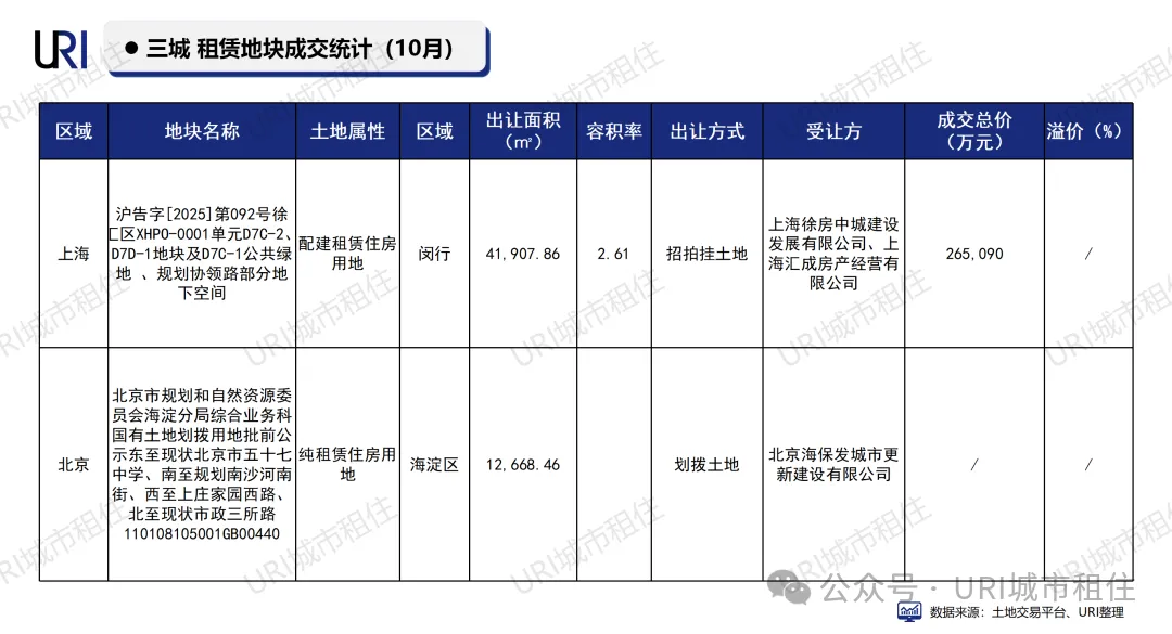 10月,上海与北京核心区域均有力推进租赁住房土地供应。上海徐汇区以26.5亿元底价成功出让一幅配建租赁住房用地;北京海淀区则以土地划拨方式,为零溢价纯租赁住房项目提供土地。