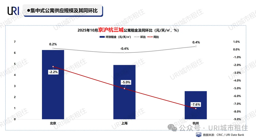 ■集中式公寓:沪集中式房源供应领跑,三城同比延续正增长,集中式公寓租金整体趋稳