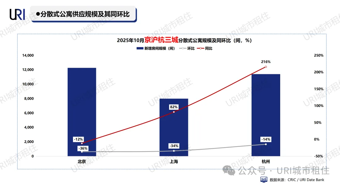 10月,上海集中式公寓新增挂牌房量达43.8万间,环比增2.4%,同比大幅增长19.7%,供应总量显著领先。北京与杭州亦保持同比增长(5.9%、12.8%),环比接近持平。