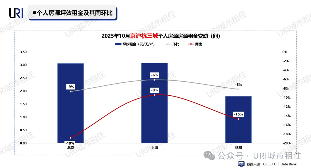 10月,北京、上海、杭州个人房源坪效租金环比全面下跌(-6%至-9%),同比亦呈双位数下滑(-9%至-19%),反映租赁市场整体需求疲软。其中上海租金绝对值(3.08元/㎡/天)仍为最高,但同比跌幅扩大至-9%,北京同比-19%降幅最为显著。