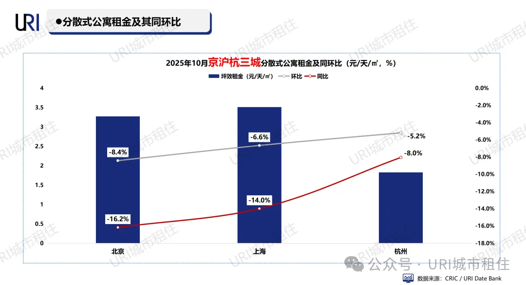 10月,北京、上海、杭州分散式公寓坪效租金环比全线下跌(-5.2%至-8.4%),同比亦呈显著负增长(-8.0%至-16.2%),反映租赁市场整体租金承压。其中上海租金水平仍最高(3.51元/㎡/天),但同比跌幅达-14.0%;杭州同比降幅相对最缓(-8.0%),韧性略强。