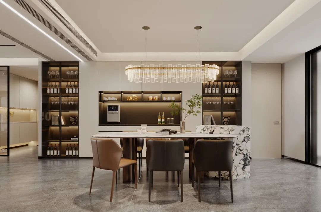 设计要点 / 以简洁线条构建空间,融合大理石、金属、皮质材质,碰撞出精致质感。色彩上,高级灰铺陈基调,搭配暖棕、米白,调和冷硬与温馨感。功能层面,客厅玻璃柜、餐厅酒柜、厨房嵌入式家电等设计,将收纳与美观结合,再以灯带、吊灯强化氛围,让美学与生活需求完美融合。