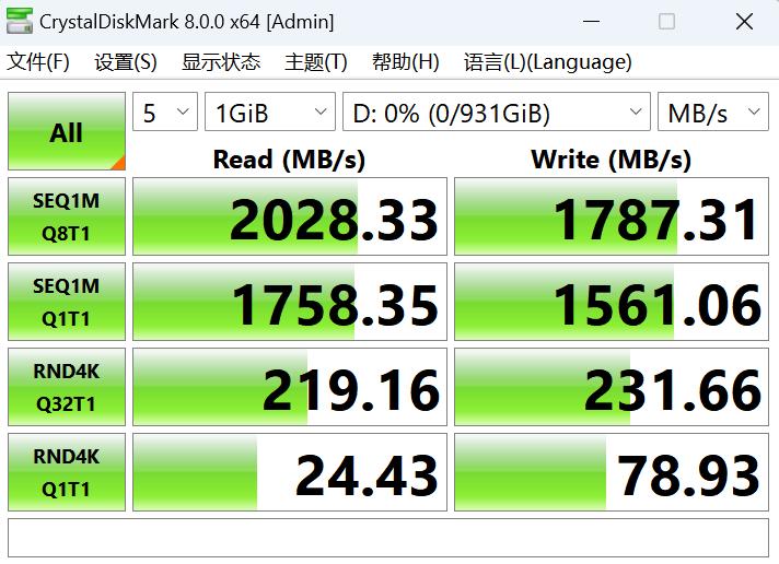 ▲使用CrystalDiskMark测得朗科ZX20的顺序读取速率为2028.33MB/s,顺序写入速率为1787.31MB/s,这在移动固态硬盘里,属于绝对的高值。