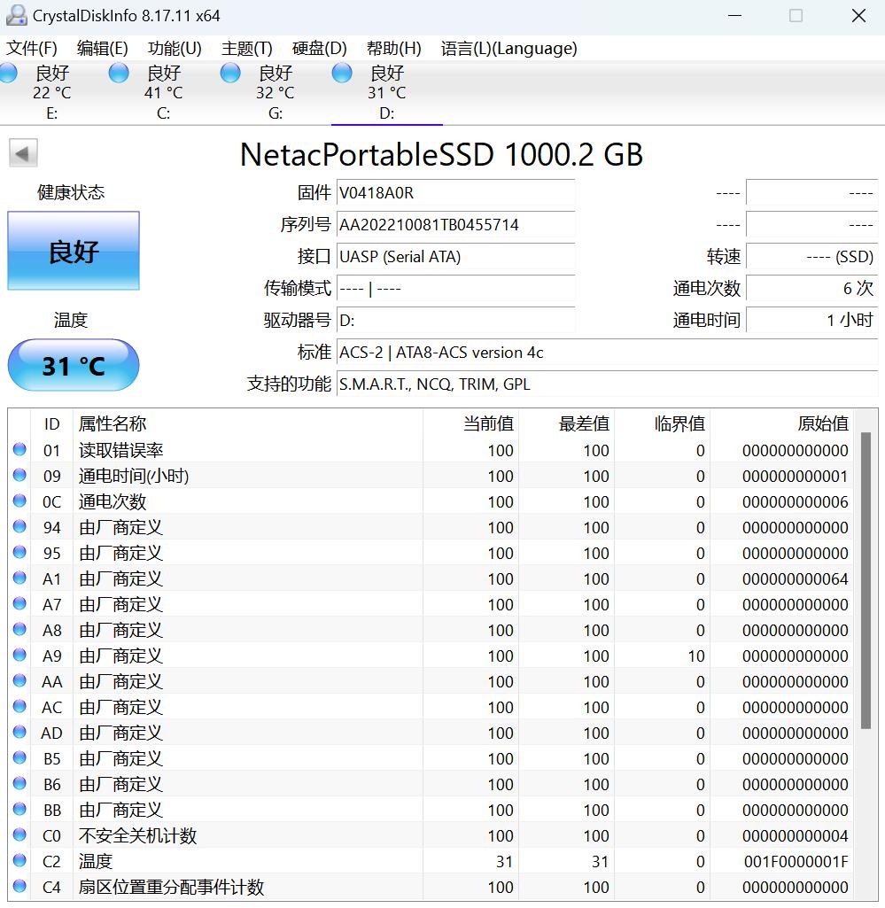 ▲使用CrystalDiskInfo测得朗科ZX20采用UASP接口,支持S.M.A.R.T、NCQ、TRIM和GPL功能。