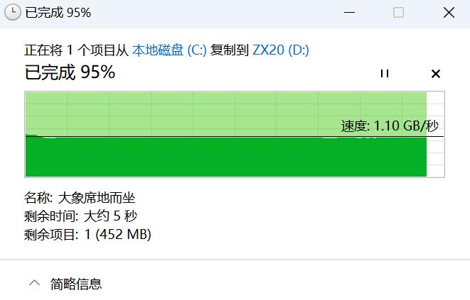 ▲实测写入速率则为1.10GB/秒,同样可以保证写入稳定不掉速。