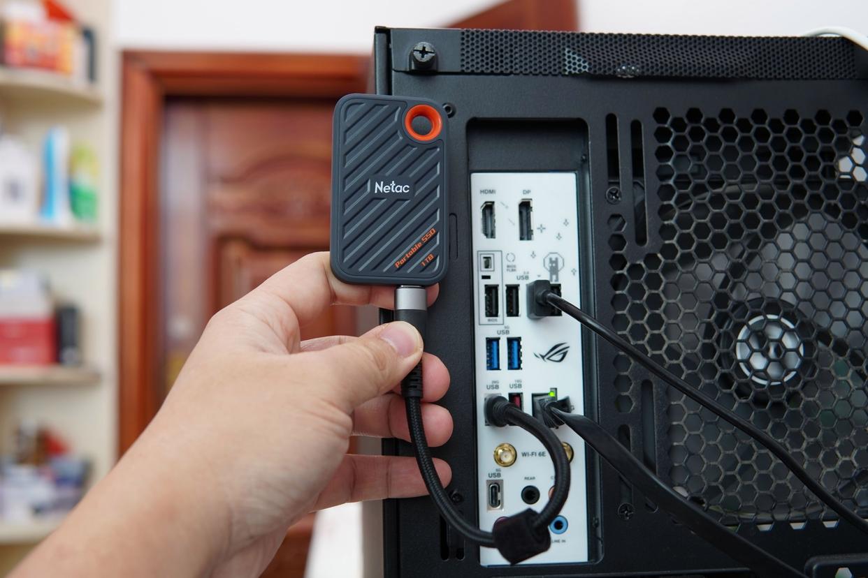 ▲朗科ZX20配备的C to C线比较短,更适合连接手机使用,如果用来连接台式机的Type-C接口,则会显得略短。不过它小巧的外形,相信大家在看到它跟台式机箱的对比时,可以有个清晰的认知。