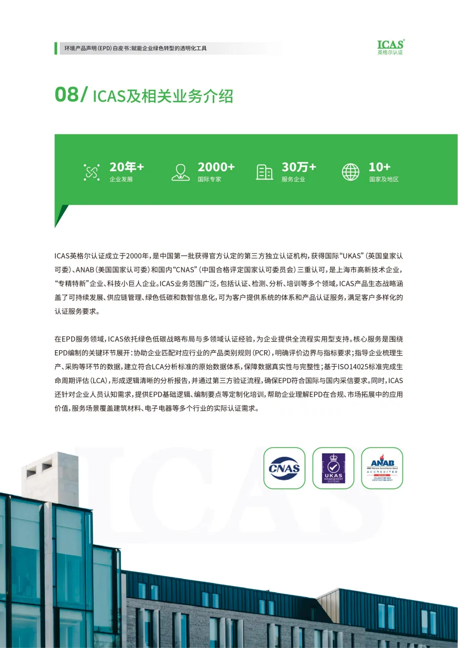 ICAS英格尔认证成立于2000年,是中国第一批获得官方认定的第三方独立认证机构,获得国际“UKAS”(英国皇家认可委)、ANAB(美国国家认可委)和国内“CNAS”(中国合格评定国家认可委员会)三重认可,在EPD服务领域,ICAS依托绿色低碳战略布局与多领域认证经验,为企业提供全流程实用型支持。