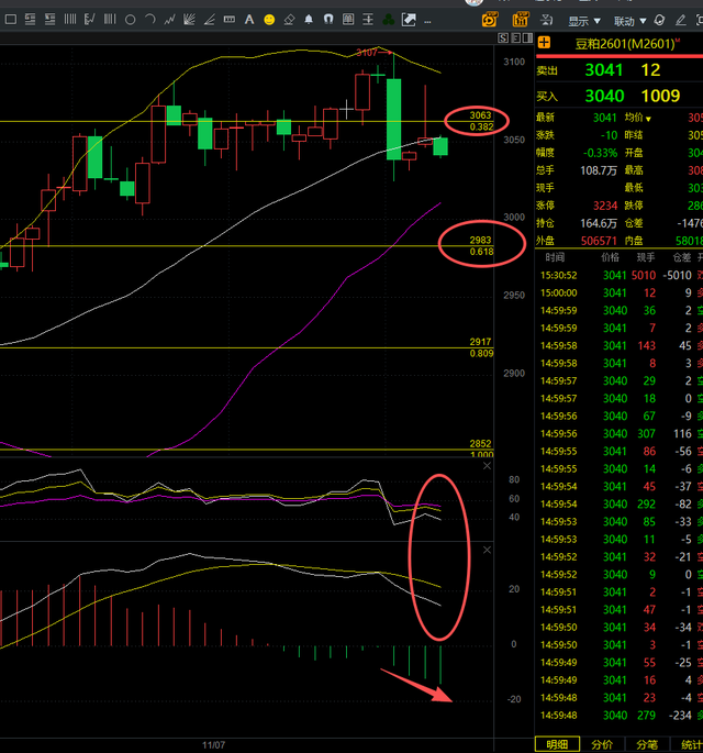 外部影响: 中粮集团采购 14 船美豆(84 万吨),CBOT 大豆 11 月 17 日大涨近 3%,成本端支撑增强技术面:短期震荡偏弱,中期仍处于 3,000-3,100 元 / 吨大区间波动,呈震荡下行态势均线系统走平,MACD 收敛,KDJ 指标拐头向下,显示短期震荡偏弱