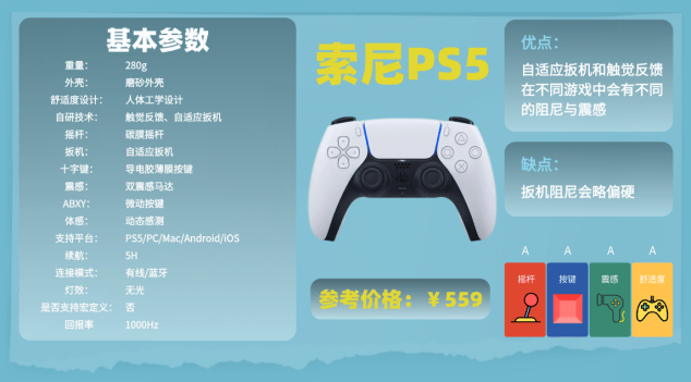 ✦核心操控延续索尼经典布局,摇杆与按键位置对老玩家几乎零学习成本。自适应扳机与触觉反馈是最大亮点,能在不同游戏提供差异化阻尼和震感,比如赛车模拟油门渐进阻力、弹道操作类游戏压枪反向反馈,大幅提升沉浸感。仅特定场景下扳机阻尼偶偏硬,部分游戏触觉反馈略“猛”,需适应找舒适区。连接支持蓝牙与USB-C有线双模式,切换流畅,无线延迟低、稳定性好,兼容PC、主机等主流设备。内置触控板、扬声器与麦克风,丰富操作和语音互动;续航中等约5小时,好在支持边充边玩,USB-C接入后体验稳定。