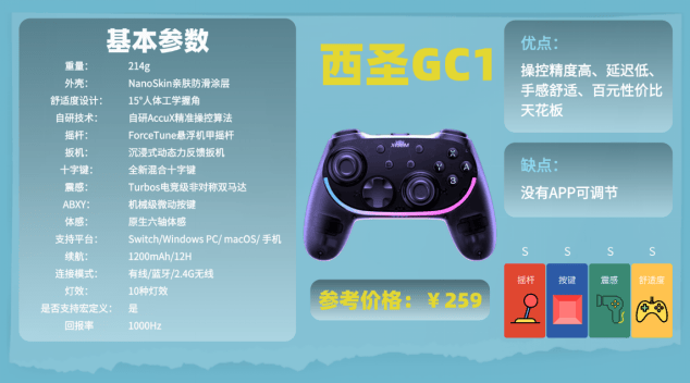 ✦在功能体验上,这款西圣GC1同样堪称满配水准,0.5ms电竞级极速连接引擎,让输入响应几乎“所想即所控”,2.4G、蓝牙、Type-C三模稳定兼容,手机、PC、Switch即连即玩。原生六轴体感系统实现1ms动作捕捉,弹道操作类游戏瞄准、赛车甩尾更跟手精准。214g轻量机身、15°握角、NanoSkin防滑涂层,长时间开黑也舒适稳固。半透明幻雾晶透机身+10种RGB灯效,科技感与沉浸感拉满。一机兼容全设备,越级硬件堆料,我敢说,在百元价位里,很少能找到能打得过它的电竞手柄,是今年最值得入手的高性价比选择之一。
