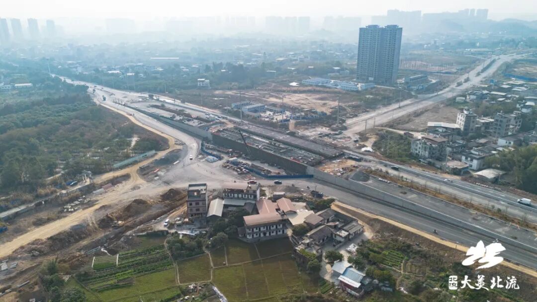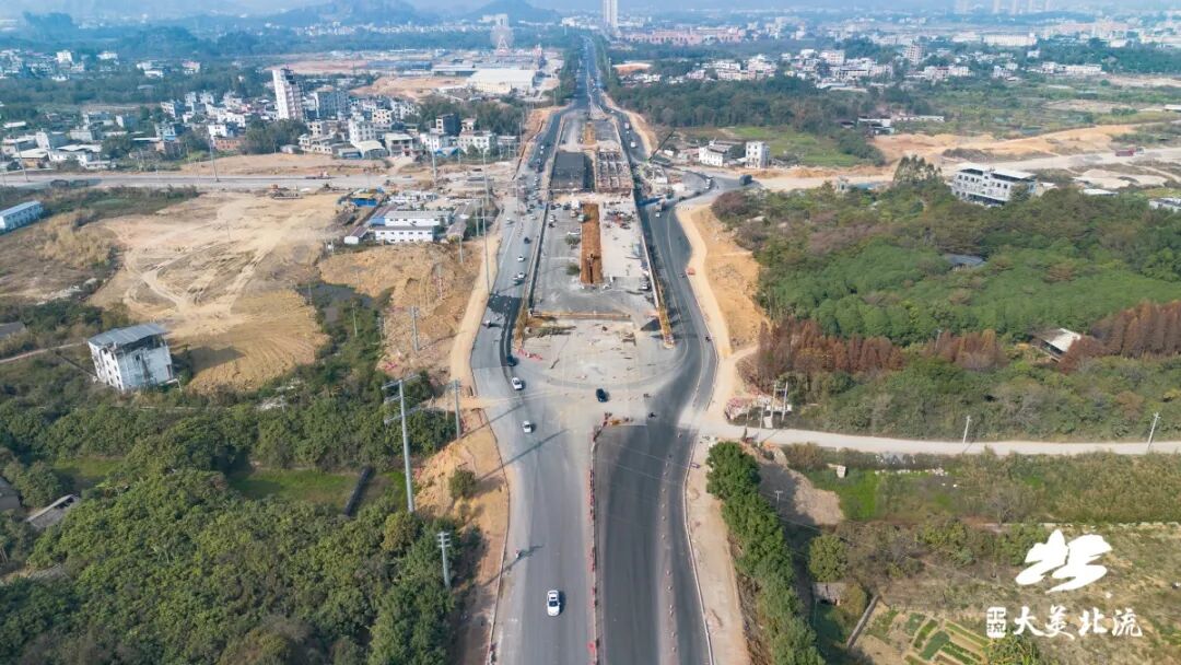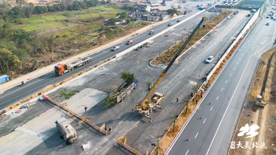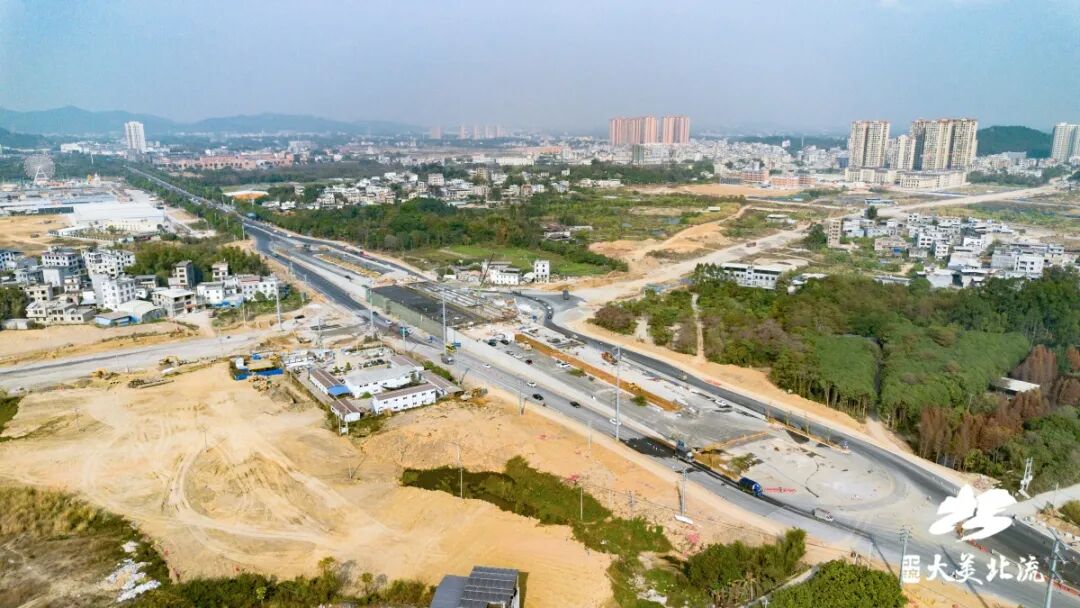 据了解,北流市首座立交桥项目位于北流市两湾新区城市主中心,地处玉容一级路北流镇甘村路段与在建深圳大道交汇处,总投资1.2亿元。项目设计道路红线宽度70米,为城市主干路标准,采用双向四车道布局,设计时速80公里。改造提升全长约920.6米,其中桥梁段长116.1米,采用预应力现浇连续箱梁结构,为跨式立交桥,双幅桥设计,单幅桥宽16.5米。项目建成后将进一步优化区域交通组织,改善沿线出行条件,缓解交通压力,促进玉北同城化,真正成为连接城市发展、沟通百姓民心的畅通之桥、幸福之桥。目前,施工方正按计划加快推进,确保春节前实现桥梁南侧通车。