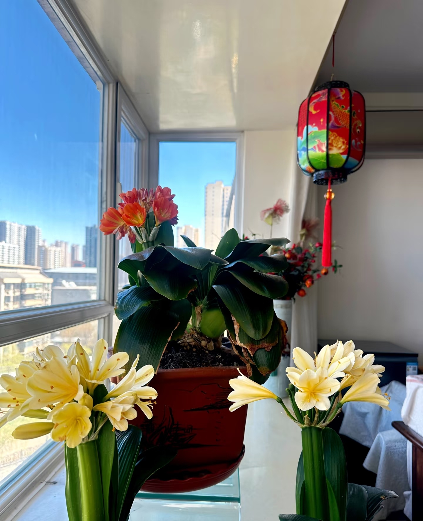 因为她平时养君子兰,会特别的注意光照,春秋季节的时候,养在阳台附近散射光的地方,每天3到5个小时;夏季高温,中午遮阴,防止晒伤,早上晒太阳2个小时左右,冬天全晒。