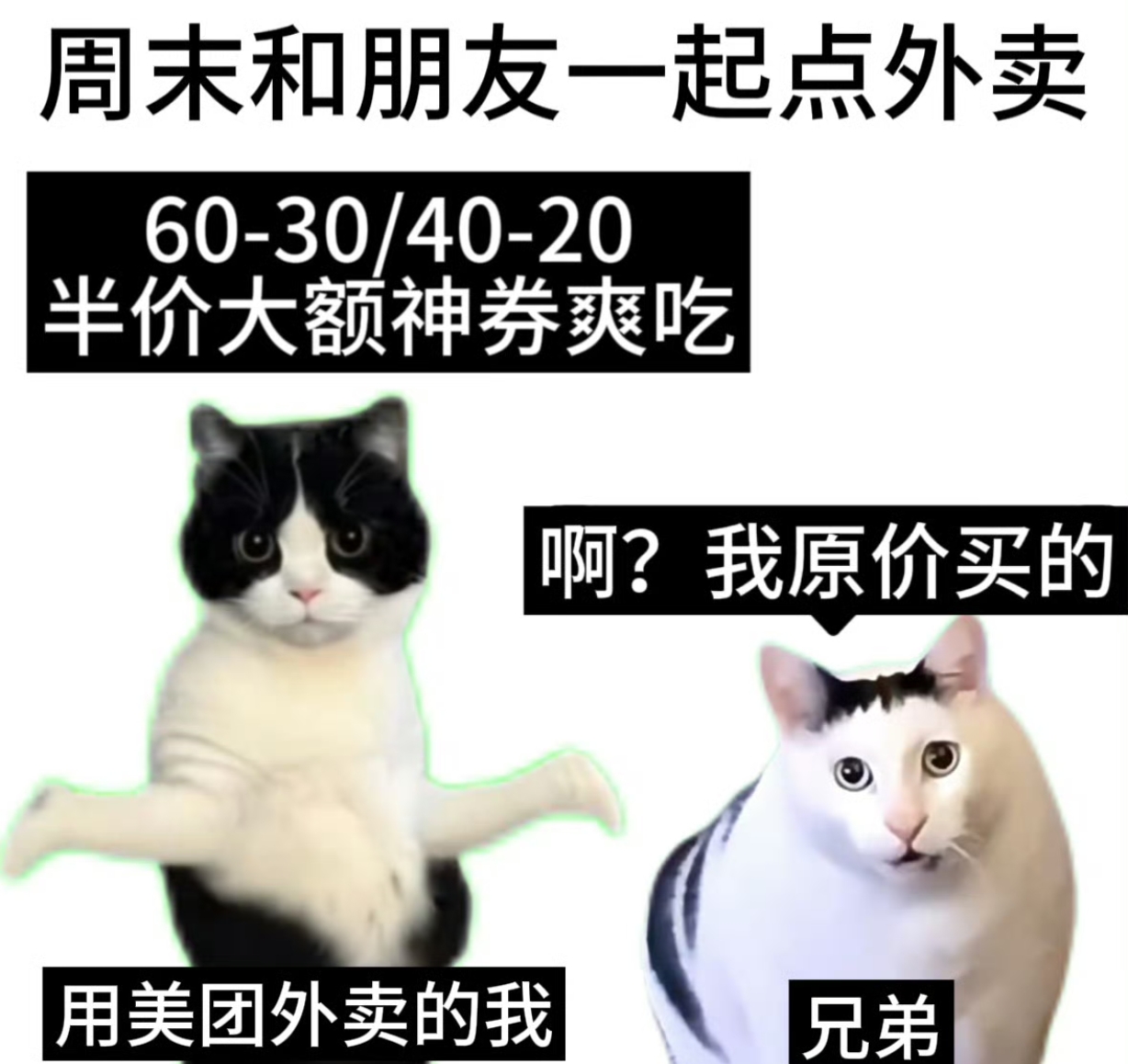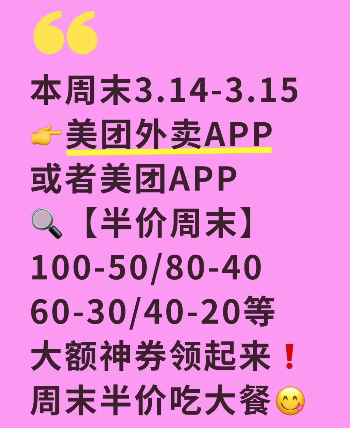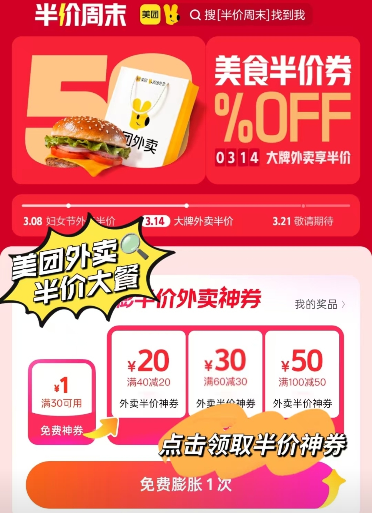 各位朋友们,周末宅家不想动,逛街逛到腿发软又懒得觅食,是不是特别纠结?别愁!美团外卖给咱们送福利啦,3月14日到15日,打开美团或美团外卖APP,搜索【半价大餐】,就能随机领取膨胀大额神券,100减50、80减40、60减30、40减20,各种优惠随机掉落,直接把半价大餐送到家门口,简直太贴心了!