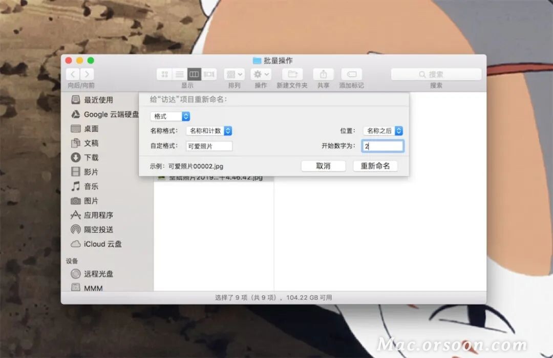 选择“格式”,如名称格式“名称和计数”,位置“名称之后”,自定义格式填入“可爱照片”,开始数字为“2”,最后点击“重新命名”的按钮。
