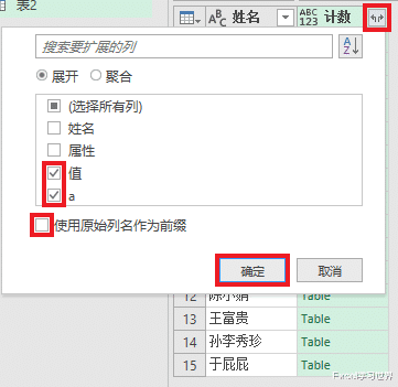 6. 展开“计数”列 --> 仅勾选“值”和“a”列 --> 取消勾选“使用原始列名作为前缀”--> 点击“确定”