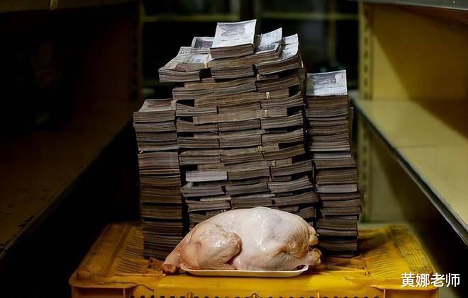 (在遭受美国长期制裁的委内瑞拉,这只2.4公斤的鸡售价1460万玻利瓦尔——背景中买它的几大摞纸币,仅约合2.22美元)