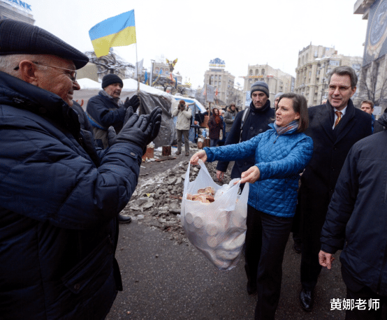 你看,这是2013年12月10日,乌克兰第二次颜色革命的时候,美国时任助理国务卿纽兰正在基辅向反政府抗议者们发放小面包。