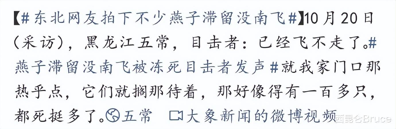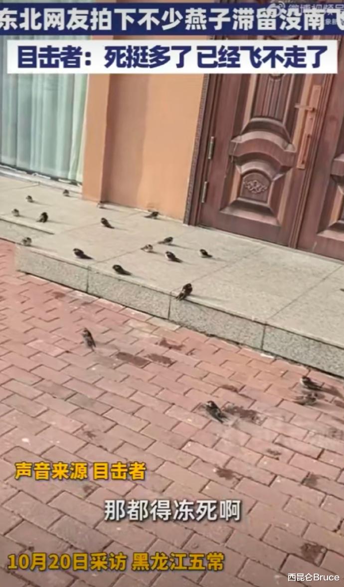 “往年这时候燕子早就飞走了,今年一下子冷得太快,它们可能还没准备好。”五常市当地居民张先生告诉记者。