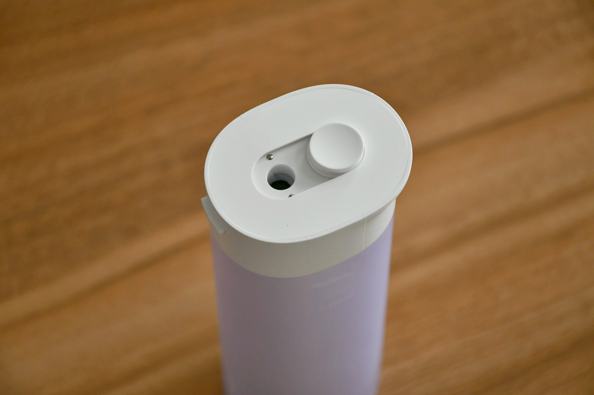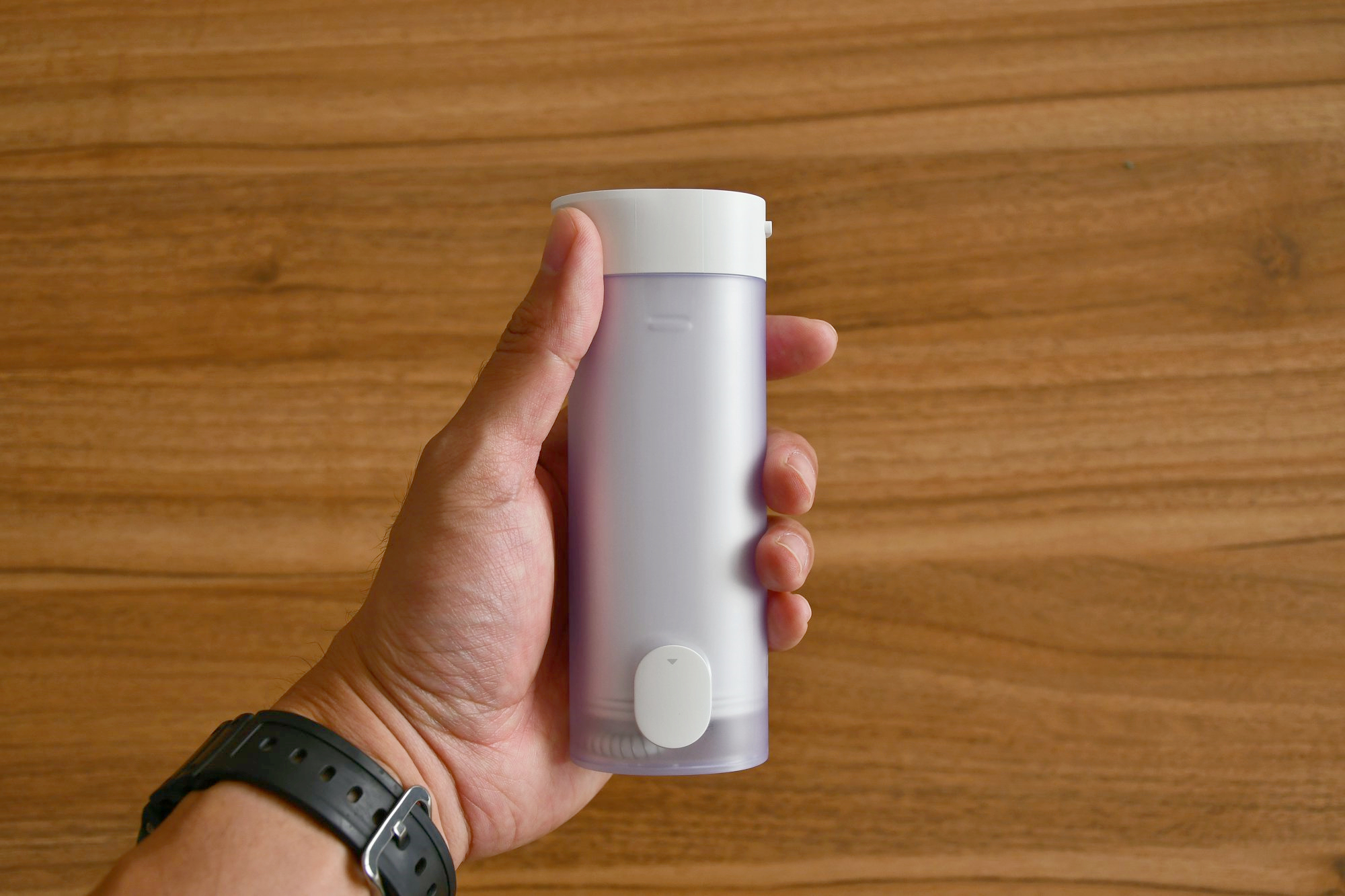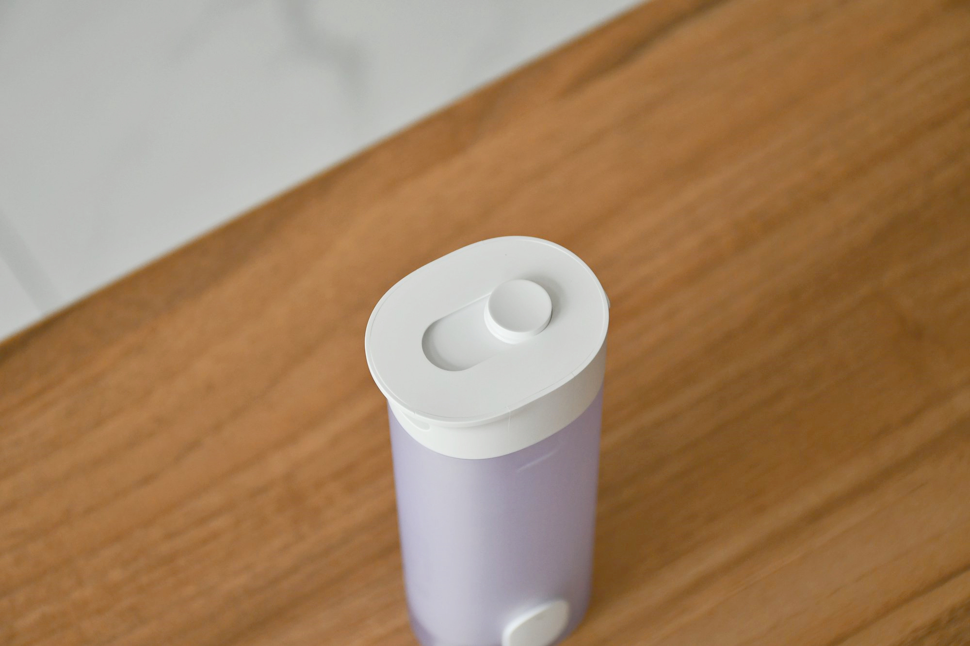 这款冲牙器有白、粉两款色款,我手上这款是白色款,可以看到白色款并不是整体白色,而是主机是白色,在水箱上做了淡紫色的设计,整体风格有些偏女性化。139*48mm的尺寸可以轻松握在手里,这个尺寸高度与一瓶易拉罐装的可乐相近。