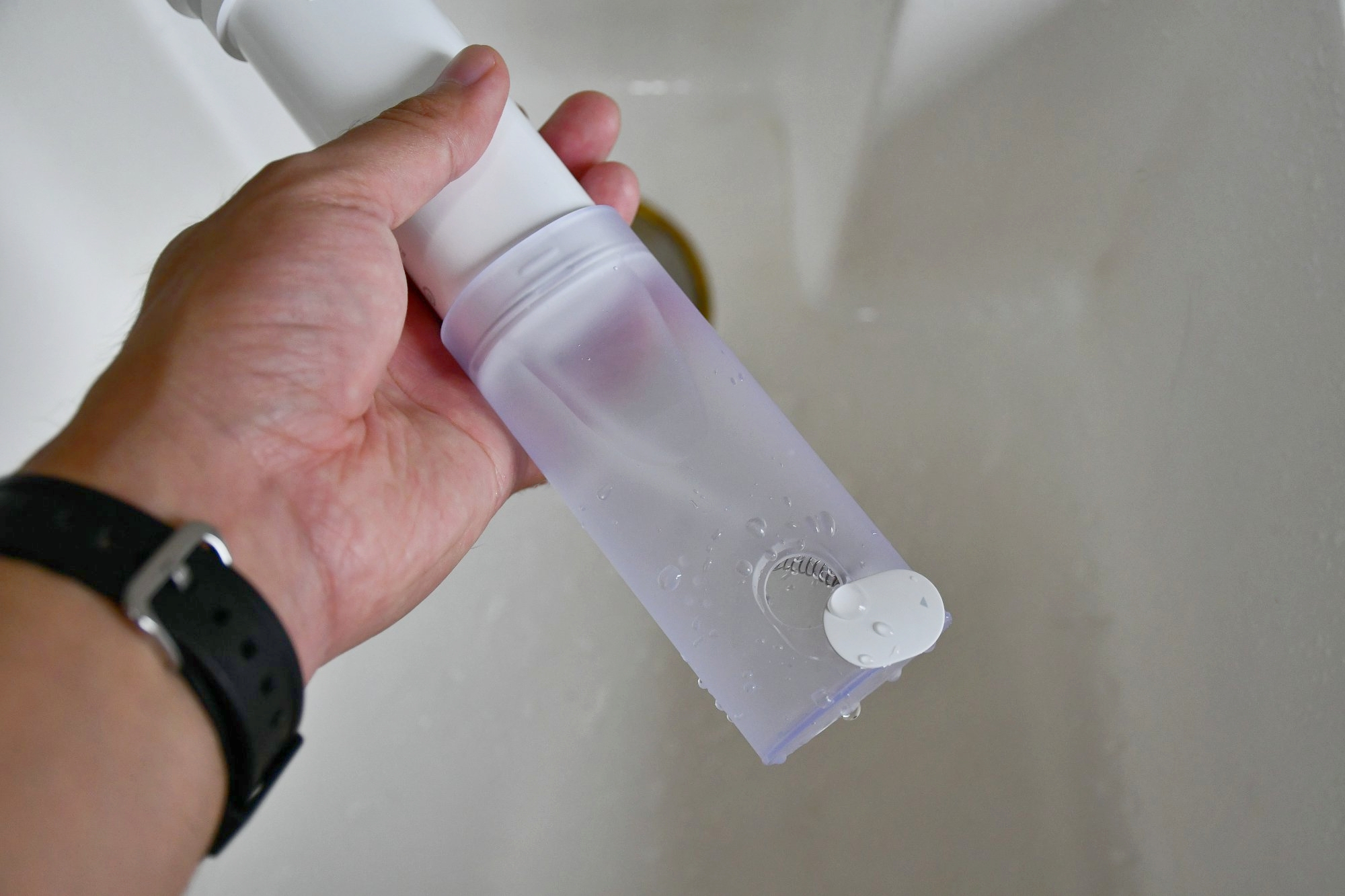 上图为第三档位(舒适模式)下的喷出的水流力度,水流同样是连续喷出,力度非常小,适合牙齿敏感的用户群,如果用来做牙龈按摩也比较适合。实测在水箱满水状态下可持续近40秒左右。