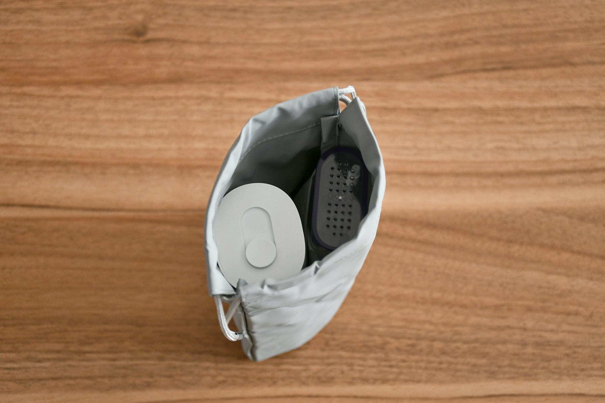 灰色的收纳袋采用防水的材质,摸起来比较柔软光滑,中间印有米家的标志,大小上用来携带冲牙器主体和喷嘴收纳盒绰绰有余。