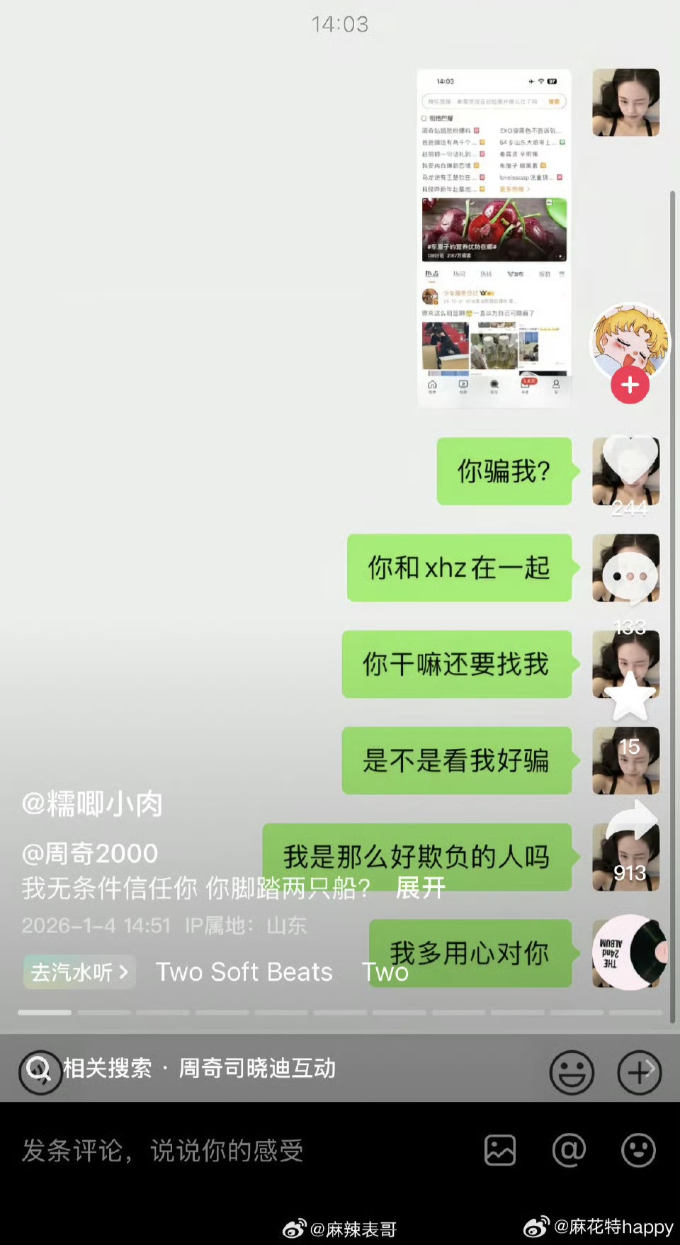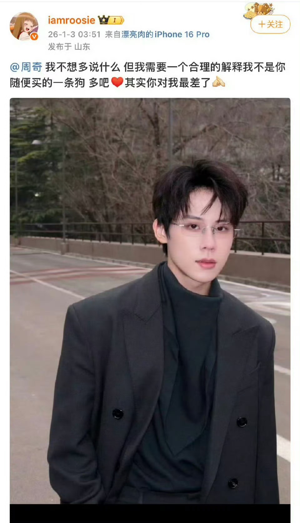 面对舆论危机,双方团队的回应堪称“冰火两重天”。周奇工作室于1月4日发布声明,仅否认“劈腿”及聊天记录真实性,却对与向涵之的恋情闭口不谈,被网友批评为“避重就轻,默认实锤”。而向涵之的粉丝则涌入其微博评论区刷屏“求分手”,担忧偶像被卷入负面舆情拖累事业。次日,向涵之发布一组九宫格照片,文案仅有一个行李箱符号,经纪公司“鲜花盛开影业”火速转发并配文“单身,在赶工”——六个字既坐实分手事实,又将焦点引向事业,被赞为“公关教科书级操作”。