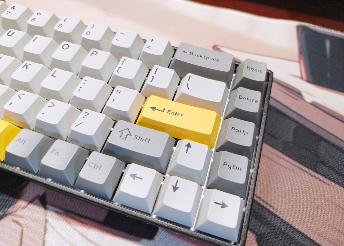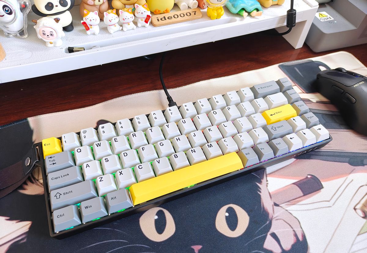 黑爵AK680 V2键盘的配色有很多种,我的这款是灰色主色,加上白色和黄色点缀,看起来很温和,也很有科技感,我很喜欢。