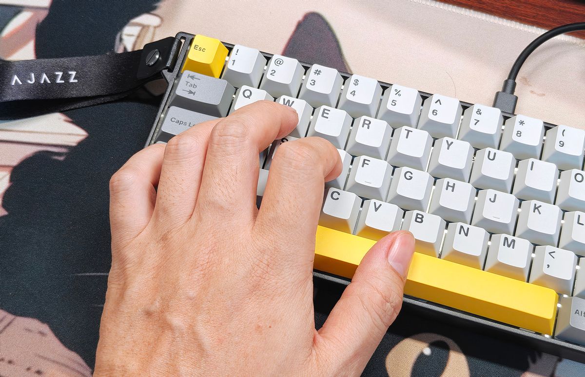 布局方面,这是一款68个按键的小键盘,顶部的F1等功能键被省略了,但可以通过Fn+数字键来实现,这种紧凑布局其实用起来还是很舒适的,像我这种大手的人也能很好的使用。