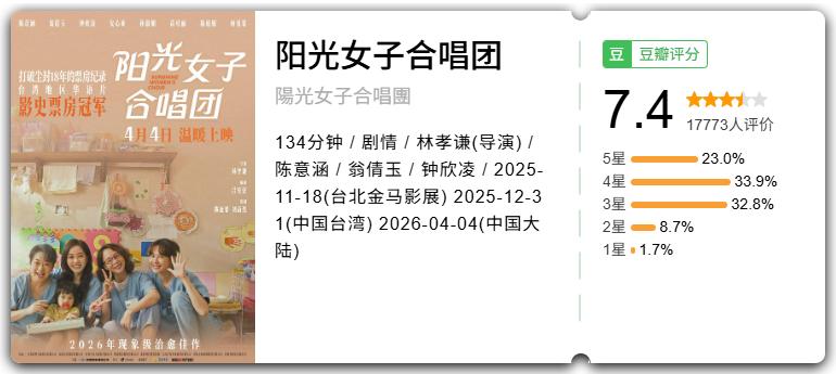 4月4日《阳光》在中国大陆上映,年初它在中国台湾拿下7.5亿台币票房、一举成为中国台湾地区华语片影史票房冠军。韩国催泪原作《和声》讲述了一位女囚在狱中生下孩子,为了给即将送养的孩子留下美好回忆,她集结狱友组成合唱团演出的故事。